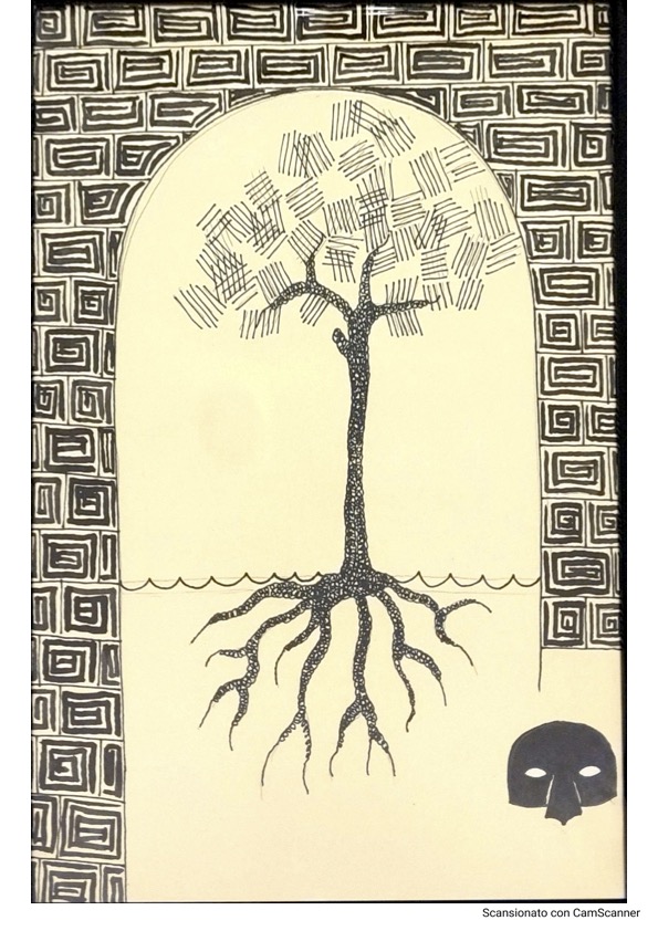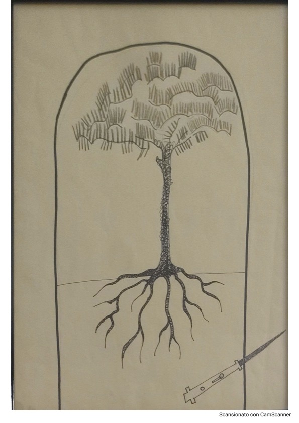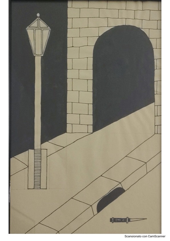 Le opere grafiche – esposte nella stanza di ingresso al primo piano della sede del Centro – sono la perfetta traduzione della sua sensibilità scenica: non semplici illustrazioni, ma vere e proprie quinte mobili per un dramma universale, cariche di una simbologia cruda e diretta. Questi cinque disegni appaiono come studi scenici per un dramma interiore, dove l’artista – forte della sua esperienza teatrale – distilla momenti di forte tensione emotiva e simbolica. Ogni immagine si presenta come un atto unico, illuminato da un senso di mistero, sospensione e attesa.