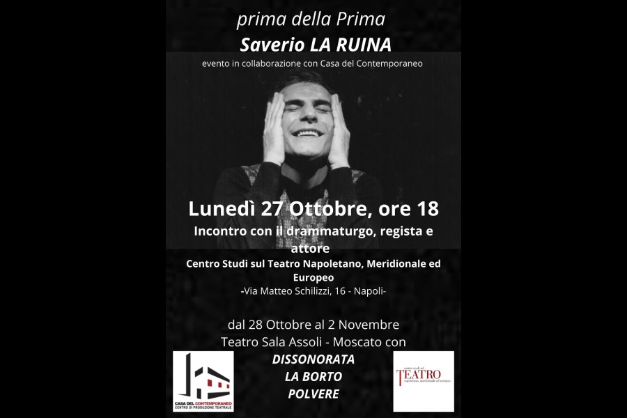 Lunedì 27 Ottobre – 𝐨𝐫𝐞 𝟏𝟖.𝟎𝟎, presso la sede dell’𝐴𝑠𝑠𝑜𝑐𝑖𝑎𝑧𝑖𝑜𝑛𝑒 𝐶𝑒𝑛𝑡𝑟𝑜 𝑆𝑡𝑢𝑑𝑖 𝑠𝑢𝑙 𝑇𝑒𝑎𝑡𝑟𝑜 𝑁𝑎𝑝𝑜𝑙𝑒𝑡𝑎𝑛𝑜, 𝑀𝑒𝑟𝑖𝑑𝑖𝑜𝑛𝑎𝑙𝑒 𝑒𝑑 𝐸𝑢𝑟𝑜𝑝𝑒𝑜, si terrà l’incontro 𝑝𝑟𝑖𝑚𝑎 𝑑𝑒𝑙𝑙𝑎 𝑃𝑟𝑖𝑚𝑎 con il drammaturgo, regista e attore Saverio LA RUINA che presenterà la sua personale, in scena al Teatro Sala Assoli – Moscato dal 28 Ottobre al 2 Novembre