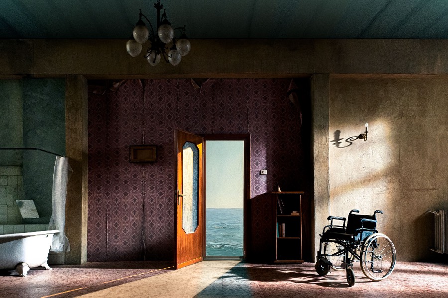 I personaggi, che nel testo beckettiano non fatichiamo a inquadrare come il segno di un’umanità relitta alle prese col proprio finale, nella regia di Russo, diventano membri di un nucleo famigliare. Sono posizionati come in una linea del tempo, da sinistra a destra: prima i genitori (Alessio Piazza e Anna Rita Vitolo) in una vasca, poi al centro Hamm (Michele Di Mauro) su una sedia a rotelle e a destra Clov (Giuseppe Sartori), il quale si muove poi, claudicante, per rispondere agli ordini del padrone/padre. Anche i costumi di Enzo Pirozzi vanno nella direzione della concretezza, tutto porta il segno del tempo (chissà da quanto questa partita sta finendo): la seta della madre, il maglione ingiallito del padre, la salopette di Clov, la tuta di Hamm. Nella scatola asfissiante e consolatoria che è la casa, l’esterno si manifesta, come possibile via di fuga, con una porta al centro, sul fondo, e, come irruzione, con la luce di due finestre alte, aperte e chiuse all’occorrenza da Clov. Quella porta centrale ci appare fin dall’inizio come la soluzione, a portata di mano. Eppure, le vie di fuga bisogna saperle usare. Quando Clov tenta per la prima volta di fuggire, resta lì, fuori dalla porta chiusa: ne vediamo l’ombra.