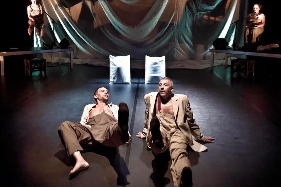 Questo testo, come molti altri, è privo assolutamente di didascalie, le battute spesso sono sintetiche, ripetute e agganciate, memori della tradizione orale del cunto siciliano, riportando in scena uno stile che ritroviamo nelle famose coppie del teatro siciliano contemporaneo, come Vetrano e Randisi, Scimone e Sframeli, ma anche all’interno dei testi di Tino Caspanello e di Rino Marino. Gli spazi bianchi, a tratti molto estesi sulla carta, sono in qualche modo riprodotti anche in scena, alternando una forte tensione ritmica, che sembra esaurirsi velocemente nella recitazione, per poi affievolirsi nel silenzio. L’idea della fiammella che scoppietta, che si accende, che brucia e poi si spegne, lasciando un alone di fumo nell’aria, è l’immagine che continuamente percepiamo davanti a questo spettacolo. Luci e ombre proiettate sul fondo, candele, candeline, ceri, chiaroscuri, questo è il mondo di Scaldati, che Cutino rappresenta perfettamente. I due attori, sui quali bisogna soffermarsi attentamente, Rosario Palazzolo e Anton Giulio Pandolfo, pur provenendo da lunghissime esperienze attoriali di altro tipo e soprattutto drammaturgiche, interpretano in maniera profonda, viscerale, consapevole, il mondo di Scaldati: non basta interpretare una parte, bisogna studiare la sua scrittura per comprendere a fondo ciò a cui lui era legato, ciò che lui percepiva e il mondo culturale da cui proveniva e a cui aveva attinto. I due attori conducono un lavoro sulla voce e sul corpo molto intenso, fisicamente proiettati verso gestualità bambinesche e movimenti lanciati all’interno di uno spazio apparentemente senza limiti e confini, proprio come si muoverebbe un bambino o un uomo mai cresciuto, perché problematico. Scaldati costringe i suoi personaggi a rimanere in una certa aura di incoscienza, di infantilismo, di apparente banalità, nonostante poi siano proprio loro a veicolare i messaggi fondamentali. Sicuramente ritorna alla nostra memoria la coppia dei becchini shakespeariani, che incarnano appunto l’incoscienza, l’ignoranza, l’apparente pazzia di Amleto e che conservano la verità. Importante anche il lavoro sulla vestizione e svestizione: Scaldati, all’interno del testo parla di abiti lasciati su una sedia, la sera prima, nell’andare a dormire, e mai ritrovati. La perdita dell’identità, il confronto tra corporeità e anima, l’essere e l’apparire: questi due personaggi sono anime in vita e corpi mai reali. Si può riflettere sulla vita solo nel momento della morte? Questo spettacolo è un gioiello della contemporaneità teatrale italiana, vincitore nel 2024 del premio ANCT Associazione Nazionale Critici di Teatro. Il teatro NEST e il Centro Studi hanno contribuito a portare avanti e a far conoscere questo prodotto pregevole, nella speranza che la drammaturgia firmata da Scaldati, autore complesso, possa essere conosciuta anche dai più giovani e da ambienti culturali e teatrali non prettamente legati al sud Italia.